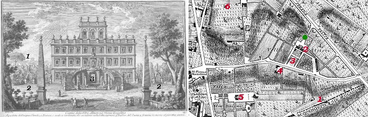 In the description below the plate Vasi made reference to: 1) Acqua Claudia aqueduct (the branch built by Emperor Nero); 2) Fountains and steps leading to the lower part of the gardens; 3) Hole in the Casino and fountain in the hidden garden. 1) is shown in another page. The small map shows also 4) Villa Astalli; 5) Villa Giustiniani Massimo; 6) Area of Horti Lamiani.