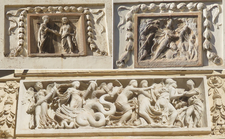 Ancient reliefs: (above-left) "dextrarum iunctio" (joining the right hands), an act which was part of the Roman wedding ceremony; (above-right) Mithra slaying the Bull; (below) Rape of Proserpina