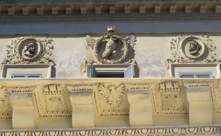 Some reliefs can be associated with the marriage with Maria Flaminia Pamphilj. They were almost all "completed" by the addition of missing parts, similar to what had been done at Casino di Villa Medici where this type of decoration was first introduced. Casino Pamphilj del Bel Respiro has a similar decoration.