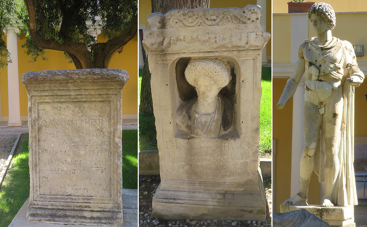 (left) Tombstone of Avonia Crhesima who lived 68 years, 7 months and 10 days; (centre) tombstone with bust of Iulia Procula (late Ist century AD); (right) statue assumed to portray Emperor Justinian