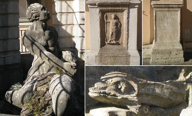 (left) Statue of a triton; (right-above) ancient relief and base of a statue of a member of the "Fabri Navales" guild of Ostia; (right-below) statue of a fish