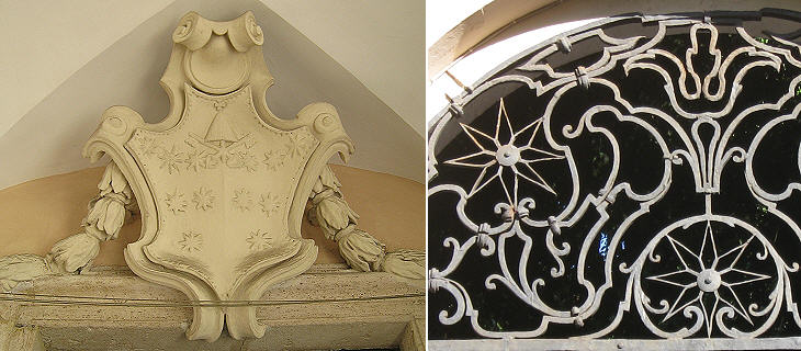 (left) Double coat of arms of the Altieri; (right) main gate decorated with the heraldic symbol of the Altieri; the image used as background for this page shows another Altieri coat of arms