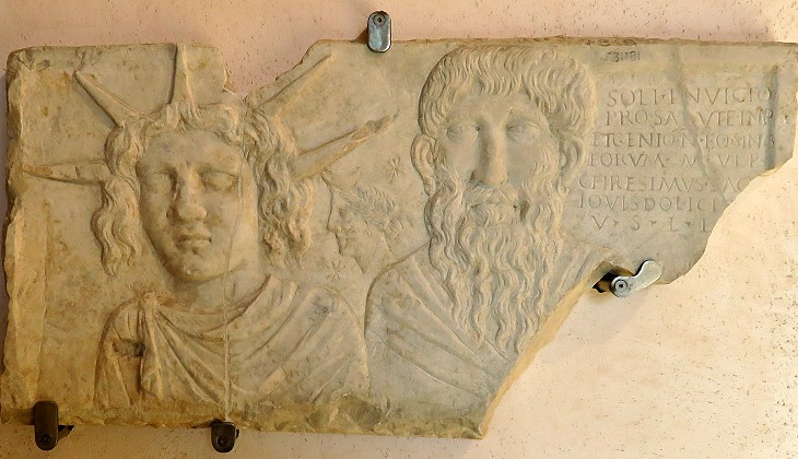 Museo Nazionale Romano: relief from Castra Equitum which depicts the Sun god crowned by solar rays, the Moon goddess bearing a crescent on her hair, and an old man, perhaps the priest Ulpius Chresimus. The inscription says "Soli Invicto pro salute Imp(eratorum) et Genio n(umeri) eq(uitum) sing(ularium) eorum M. Ulp(ius) Chresimus sace[rd(os)] Iovis Dolich[eni] [dedicavit]" - Dedicated to Sol Invictus and to the Genius of the Imperial horseguards for the emperors' health, by M. Ulpius Chresimus, priest of Jupiter Dolichenus.