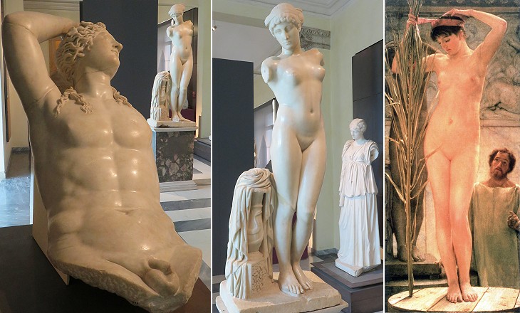 (left/centre) Musei Capitolini: statues found in 1874 in the area of "Horti Lamiani": Recumbent Dionysus/Bacchus and Esquiline Venus; (right) "A Sculptor's Model" by Sir Lawrence Alma-Tadema (1877); the Esquiline Venus is hidden by the palm frond