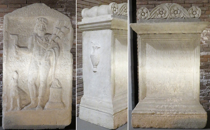 Musei Capitolini: (left - from Castra Equitum) altar dedicated to Silvanus (first half of the IInd century - see a relief on another altar and inscriptions indicating the sites of shrines to the god); (right) stela of freedman Tiberius Iulius Xanthus (it was found between Villa Altieri and Porta Maggiore)