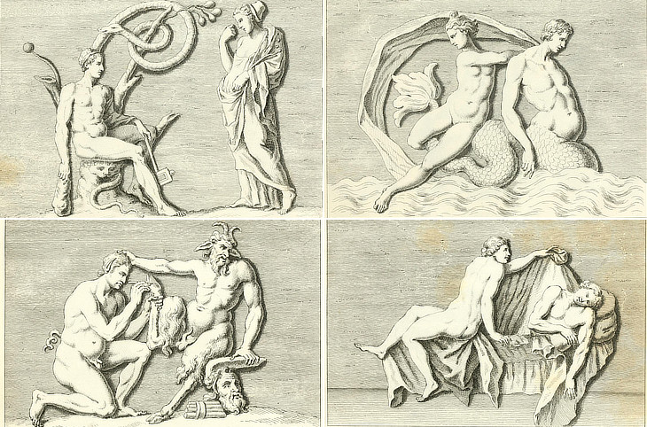 (above) Ancient reliefs: (left) Bellerophon taming Pegasus; (right) Achilles at Scyros, where the hero disguised himself as a girl;