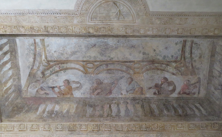 Baroque Roman composers are best known for their religious works, but they were often asked by their patrons for secular music to be performed by small ensembles. The restoration of the ceiling fresco lets us understand what the original function of the nymphaeum was and how it was used. A space illusorily conceived as a pergola in a garden, animated by music and songs, poetry and cultured conversations in the shadow of the ancients and of nature. You may wish to see a page on some finely decorated Renaissance and Baroque musical instruments.