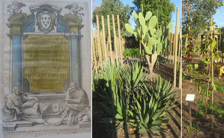 (left) Frontispice of the book by Tobia Aldini; (centre/right) plants from America in a small area near the terrace overlooking the Forum