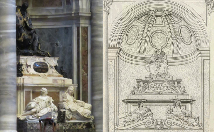 Bronze and marble Monument to Pope Paul III by Guglielmo della Porta (1575 - based on a project by Michelangelo) in a niche on the left side of the Chair of St. Peter and in an engraving by Paul Letarouilly in "Le Vatican et la basilique de Saint-Pierre de Rome" (ca 1840)