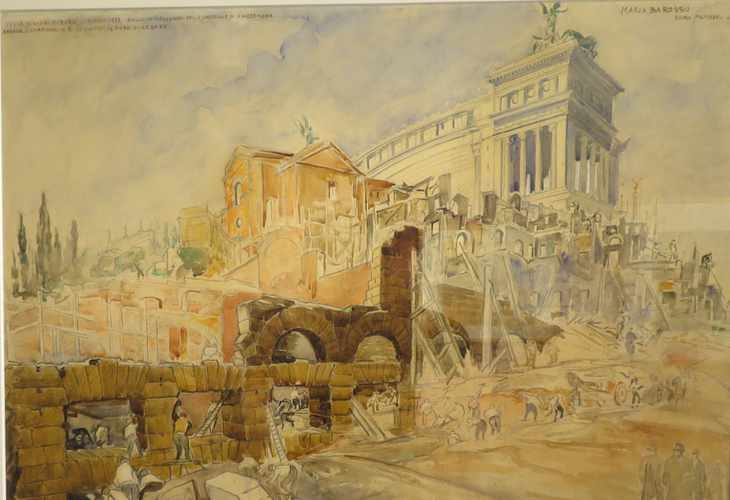Temporary exhibition at Centrale Montemartini: the pulling down of the buildings of Via Cremona to unearth the Forum of Caesar in a 1932 watercolour by Maria Barosso, an archaeologist. The view shows also S. Maria in Aracoeli and Monumento a Vittorio Emanuele II. The painting was made at the request of Antonio Munoz, the Superintendent in charge of the excavations