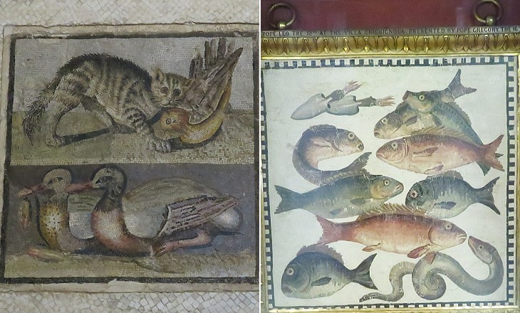 Floor mosaics from a Roman villa at Cecchignola, south of S. Paolo alle Tre Fontane: (left) Museo Nazionale Romano (see a better version from Casa del Fauno at Pompeii); (right) British Museum