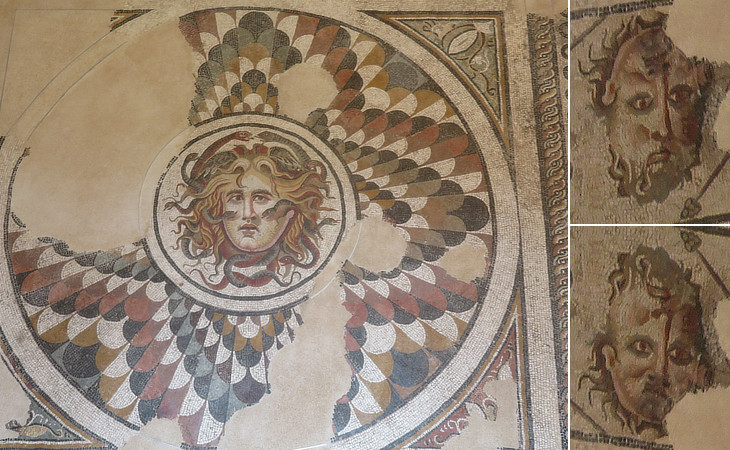 Museo Nazionale Romano: (left) detail of a floor mosaic discovered in 2006 at S. Palomba, not far from Albano; it portrays the head of Medusa; (right) another (small) detail which depending on the point from which it is seen portrays an old or a young man