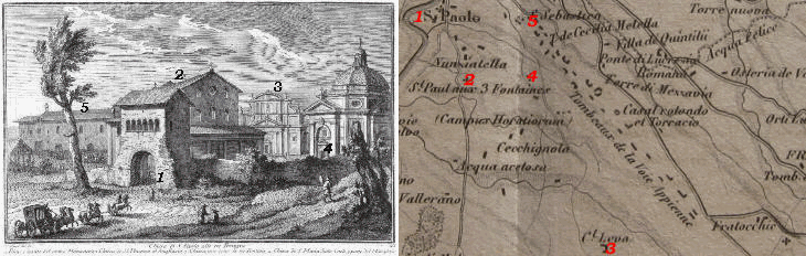 In the description below the plate Vasi made reference to: 1) main gate and walls surrounding the monastery; 2) SS. Vincenzo e Anastasio; 3) S. Paolo alle Tre Fontane; 4) S. Maria Scala Coeli; 5) Part of the monastery. The small 1850 map shows: 1) S. Paolo Fuori le Mura; 2) S. Paolo alle Tre Fontane; 3) Santuario del Divino Amore (Castel di Leva); 4) la Annunziatella; 5) S. Sebastiano fuori le Mura.