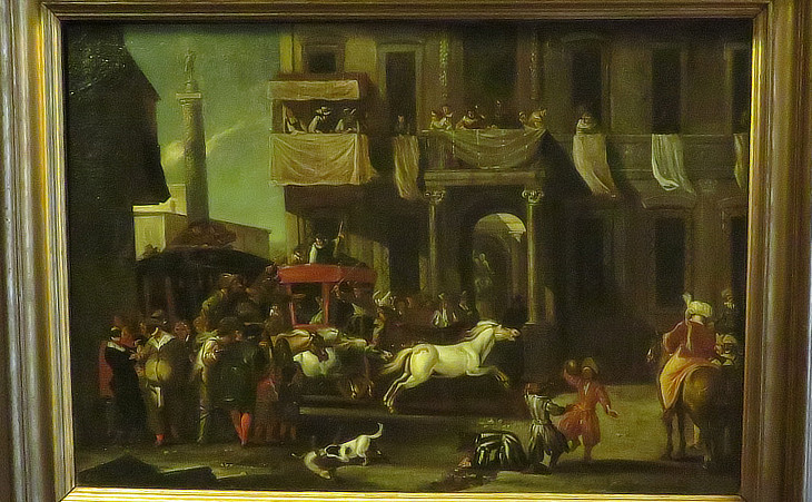 The horses, without jockeys, traditionally started the race at Piazza del Popolo and galloped down the via del Corso to the finish in Piazza Venezia. In this painting, however, they appear to be galloping in the direction towards the Piazza del Popolo. Via del Corso, originally called via Lata, was renamed after this annual event, which included additional celebrations hosting masquerades and allegorical carriages. In the courtyard of Palazzo Verospi it is possible to see the Verospi Jupiter, which is now in the Vatican Museum; at the time, it was the centrepiece of the family's collection of antiquities. For the race the palace façade was decorated with draperies. Jan Miel belonged to the group of Flemish painters called the Bamboccianti, spearheaded by Peter Van Laer. They priviliged the depiction of scenes involving ordinary people.