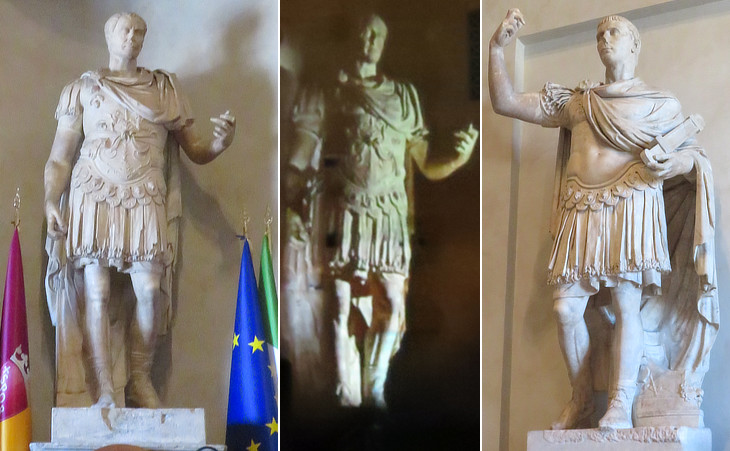 Aula Giulio Cesare - ancient statues: (left) Julius Caesar; (centre) the same projected on the back of the Curia; (right) a Roman "navarca", a commander of warhips, which was thought to portray Emperor Augustus