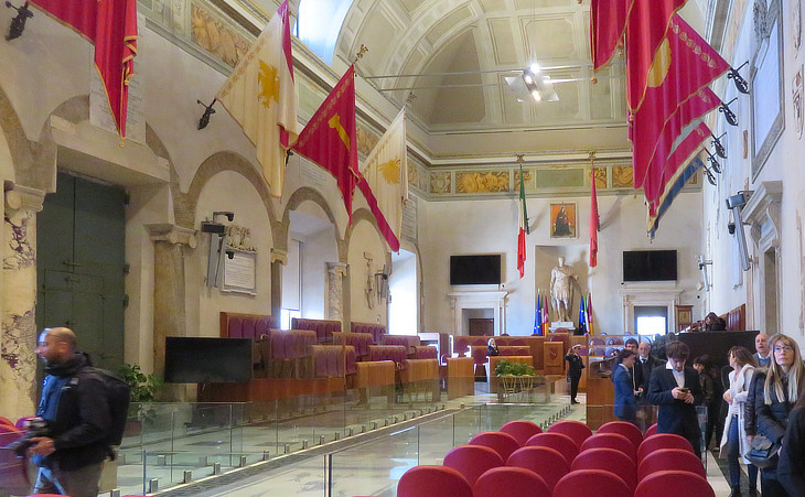 This hall is used for meetings of the Giunta Capitolina, the executive body of the City of Rome which is composed by the Mayor and 12 Assessori each of them in charge of a portfolio. Aula Giulio Cesare is decorated with flags of the 22 rioni which existed in 1921, but the oldest flags of the first rioni are kept in a cupboard in Sala delle Bandiere. The old symbol of Rione Sant'Angelo is a fish because the fish-market of Rome was there, but it was replaced by an angel with reference to the church by the same name in the XVIIIth century tablets indicating the borders of the rioni .