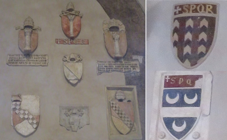 Aula Giulio Cesare - coats of arms which were placed on the façade and were removed when it was redesigned: (left) Popes Martin V (3), Eugenius IV, Boniface IX (2) and Alexander VI; (right) two senators of Rome: that below belonged to Raimondo De' Tolomei from Siena, senator in 1358