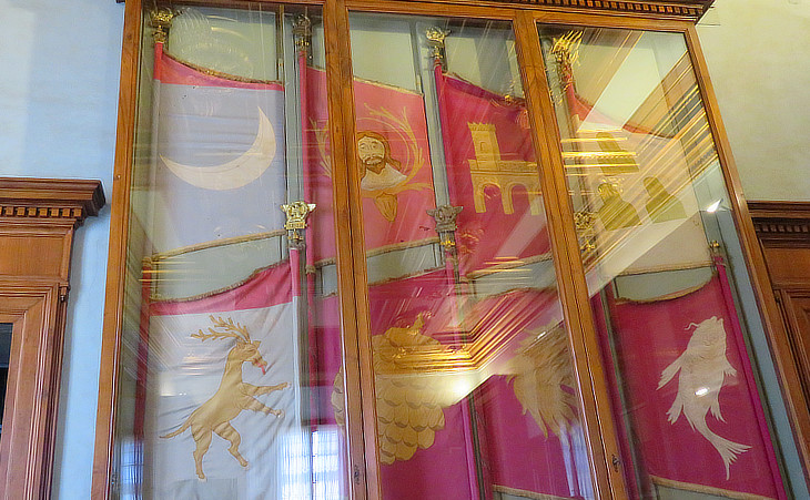 Sala delle Bandiere (inside the tower of Pope Martin V): symbols of the oldest rioni: (above) Campo Marzio, Sant'Eustachio, Ponte and Monti; (below) Regola, Pigna, Campitelli and Sant'Angelo