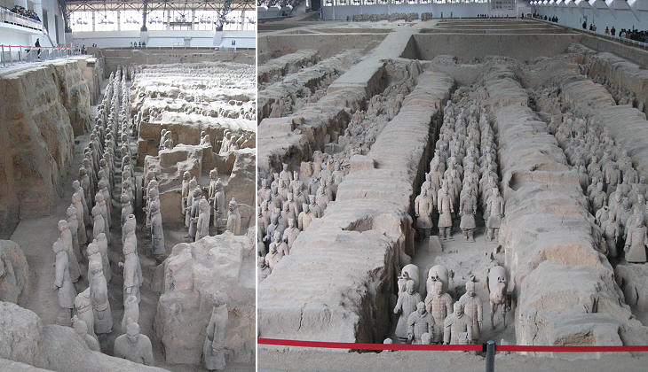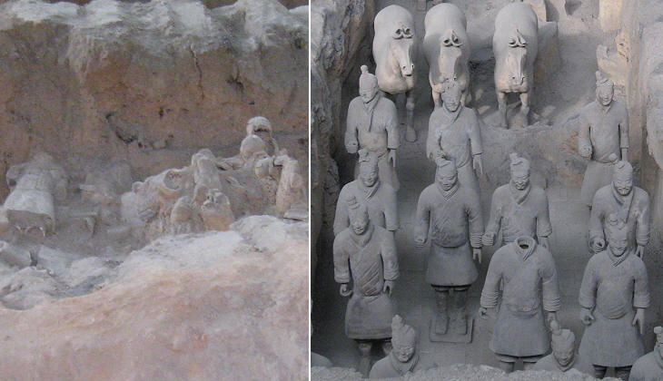 Qin Shi Huang tomb - Pit 1: (left) how the soldiers were found; (right) how they have been arranged