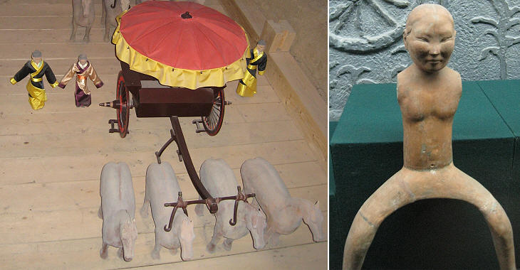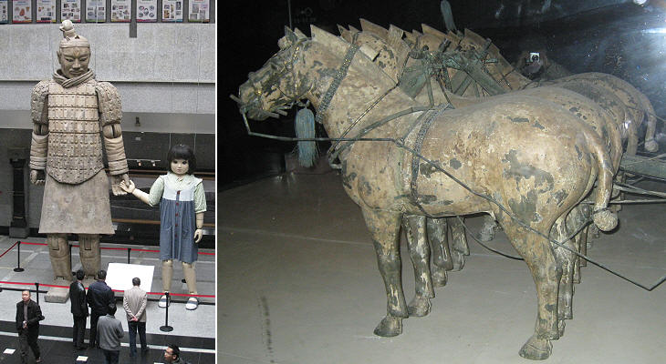 Han Yangling Museum exhibits: (left) reconstruction of a chariot; (right) a warrior with Mongol features
