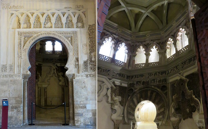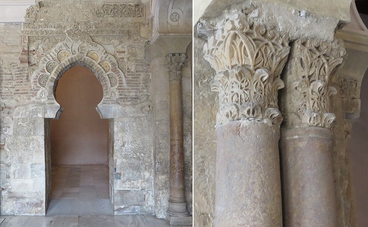Aljaferia: Mosque: (left) portal with an alfiz panel, i.e. a rectangular panel which encloses the outward side of an arch; (right) interior
