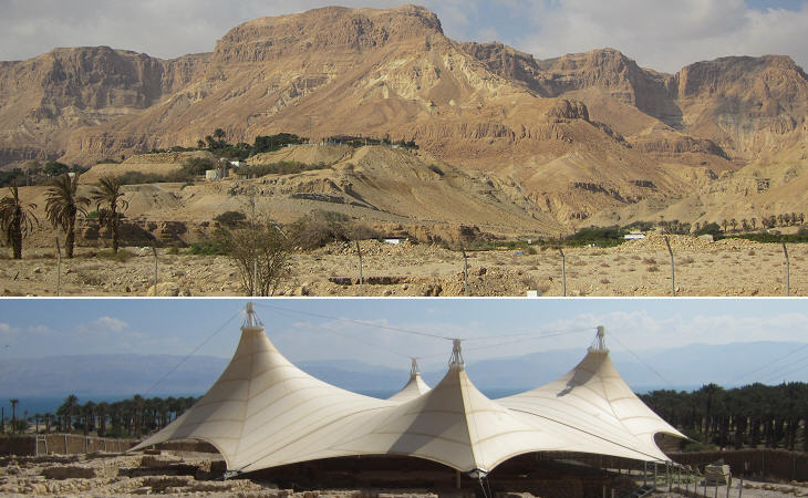 (above) Mountains at Ein Gedi; (below) structure protecting the synagogue