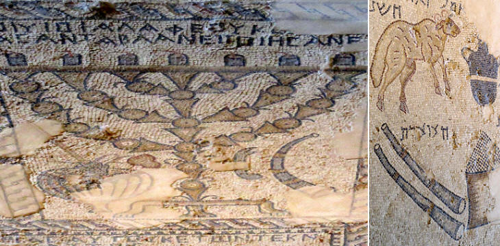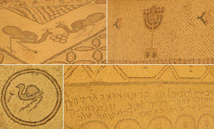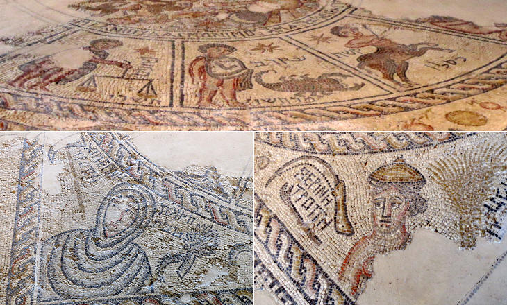 Details of the mosaic, including inscriptions in Hebrew, one of which asks Abraham, the Jewish months and the signs of the Zodiac to bless Israel