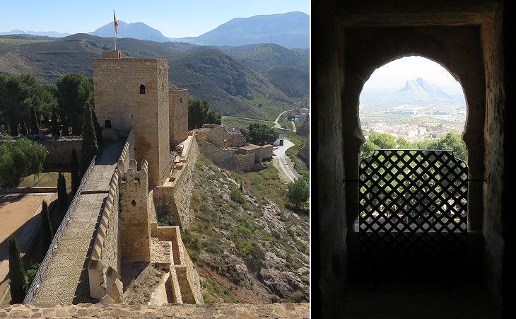 Alcazaba: (left) view of the towers; (right) view of Peņa de los Enamorados from the tower with the flag