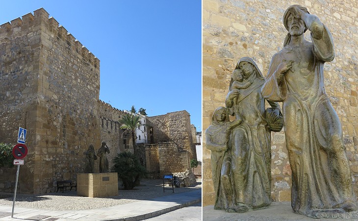 Wall of Plaza del Carmen and a 2010 statue by Jesus Gavira portraying a Muslim family leaving the town