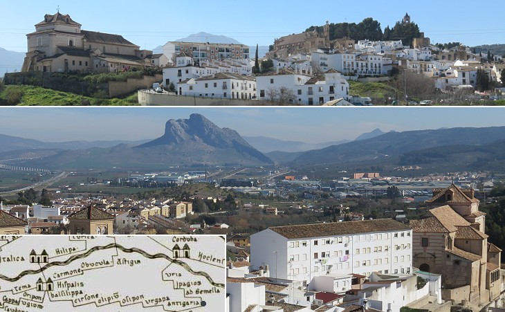 (above) View of the town: (left) El Carmen; (right) Santa Maria la Mayor and the castle; (below) view from Santa Maria la Mayor towards Peņa de los Enamorados, an isolated mountain; (inset) detail of "Tabula Peutingeriana", a Vth century map of the roads of the Roman Empire; it shows Anticaria (Antequera) on the road between Cordoba and Hispalis (Seville)