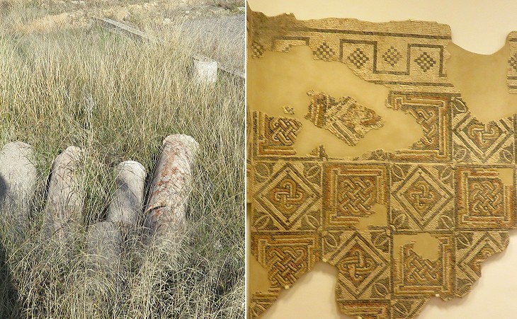 (left) Ancient columns in the site of a Roman villa near the railway station; (right) Museum of Antequera: mosaic from Villa de Caserio Silverio (IIIrd century AD)