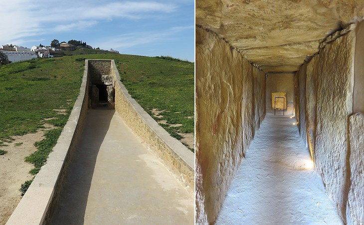 An interesting aspect of Dolmen de Menga is its orientation towards Peņa de los Enamorados, which indicates that the mountain was regarded as a holy site. You may wish to see the megalithic tombs of Mycenae and the corbelled cryptoporticus of Tiryns which were built with techniques similar to those employed at Antequera.