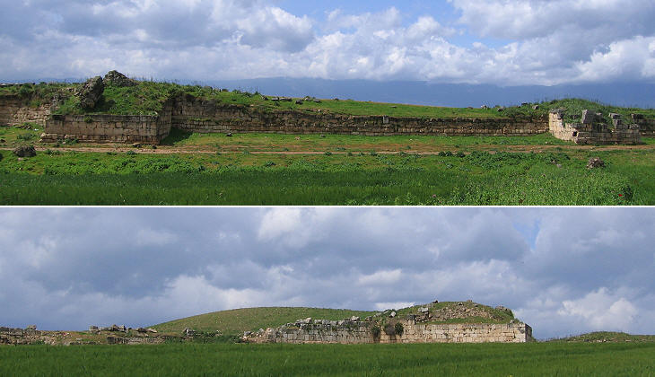 The city of Apamea was protected by a 4 mile long wall which included the acropolis. The walls were built at the time of the Seleucid Empire, but they were modified several times; there is indication that they were strengthened in the early IIIrd century AD and yet in 252 the Sassanids managed to shortly occupy Apamea. The walls protecting the northern part of Apamea were rebuilt by Emperor Justinian after two earthquakes in 526 and 528. Today the ancient walls are mainly visible in the north-eastern sector of the town.