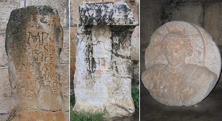 Museum of Apamea; (left) Latin inscription making reference to Emperor Vespasian; (centre) tombstone of Aurelius Mucianus, a "discens lanciarius" (light infantry trainee) of Legio II Parthica shown holding five javelins; (right) relief portraying Sol Invictus (Unconquered Sun)