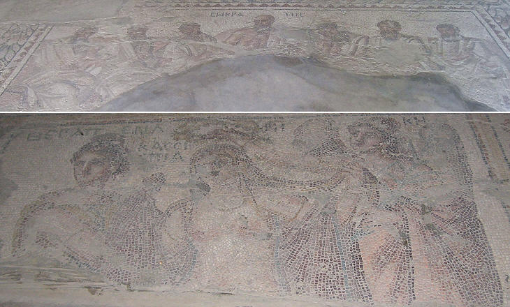 Museum of Apamea: mosaics found under the Eastern Cathedral: (above) Socrates and his disciples (see a fine mosaic portraying Socrates with other philosophers which was found near Baalbek); (below) Cassiopeia, mother of Andromeda, being crowned for her beauty which is superior to that of the Nereids