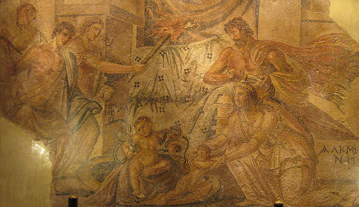 Museum of Maaret an-Nouman: IIIrd century mosaic portraying infant Hercules strangling the serpents sent by Juno to kill him while Iphicles, his half maternal twin brother, asks Alcmene, their mother, for help (see the same subject in a Vth century BC vase at the British Museum)
