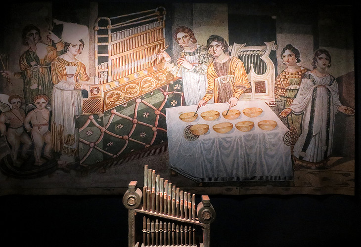 The mosaic is dated late IVth century and it is extraordinary because of both its workmanship and its subject: a live performance by six female musicians with clappers, an organ, a double flute, metal sounding bows, a cithara and castanets.