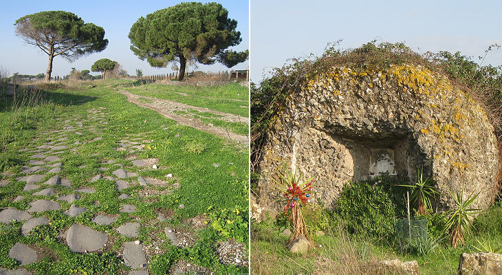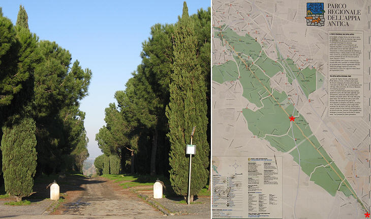 (left) Via Appia Antica at the junction with Via Appia Nuova; (right) modern map of Via Appia Antica: