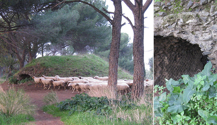 (left) A hidden tomb; (right) detail of the entrance in "opus reticulatum"