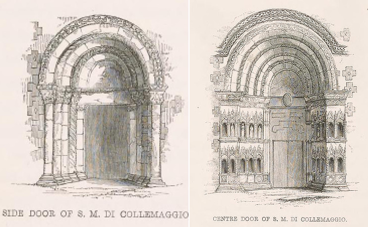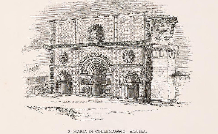 The Church of Santa Maria di Collemaggio is highly interesting, and as remarkable for the beauty of its architectural details as for the whimsical appearance of its principal front, which is formed of red and white marble so arranged as to have rather the look of Chinese workmanship. (..) The situation of Santa Maria di Collemaggio is very striking: it stands alone at a short distance from the city, overlooking the wild vale of Aquila, with the pale peaks of Monte Corno shining against the dark-blue sky.