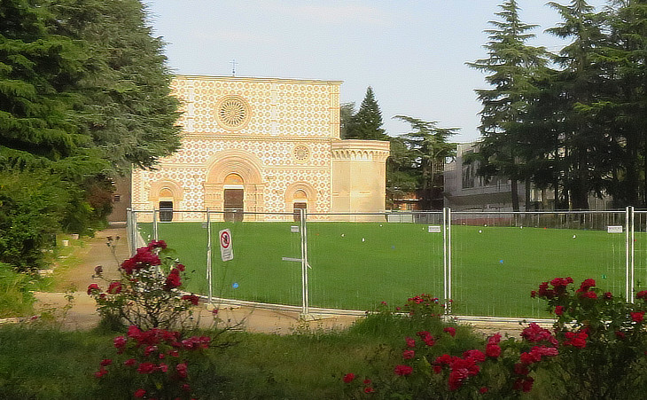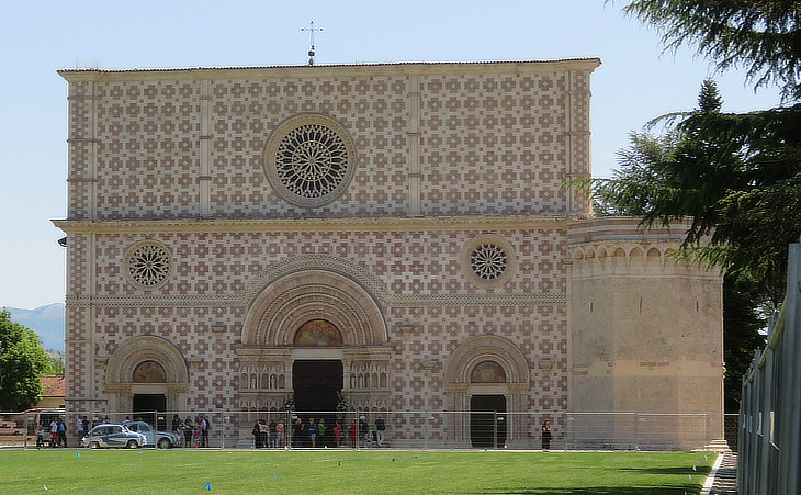 S. Maria di Collemaggio from the end of a modern grass avenue leading to it
