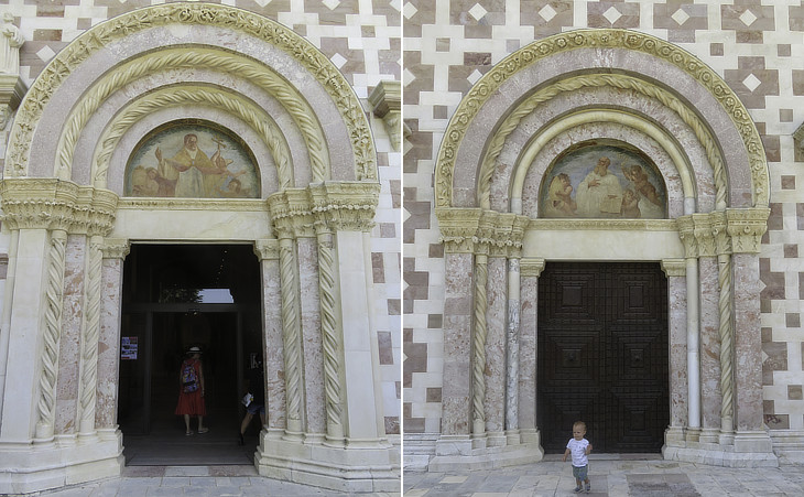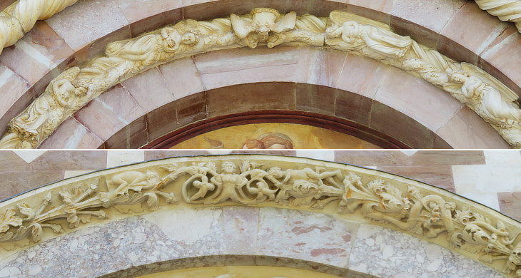 The design of the side portals is not entirely identical and they both jut out from the front of the church. This suggests that they were placed there during one of the many restorations of the building and most likely they were not initially made for its façade. The need to adjust their size to the new location could explain why they have a very slightly horseshoe design.