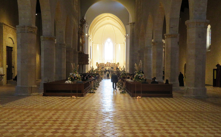 The date of its erection is about 1260, but the interior is entirely modernized. (..) The aisles were silent and deserted, the whole building in a neglected condition; and the mind involuntarily recurred, in contrast, to the coronation of Pope Celestine, in 1294, and the two hundred thousand spectators of that scene of pomp. Lear