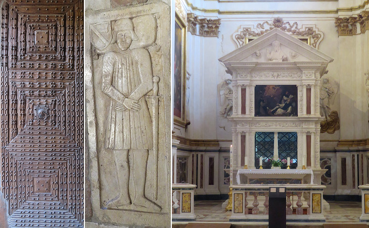 (left) XVIIth century door of the left portal; (centre) tombstone of Nicola Moczapede, a XVth century local knight; (right) monument to Pope Celestine V