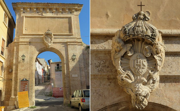 (left) Porta Bazzano; (right) a sort of coat of arms with the crown of the Kingdom of Naples, the symbol of St. Bernardino da Siena and the eagle of L'Aquila