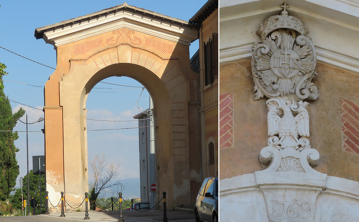 (left) Porta Castello; (right) its 1769 "coat of arms", similar to that at Porta Bazzano