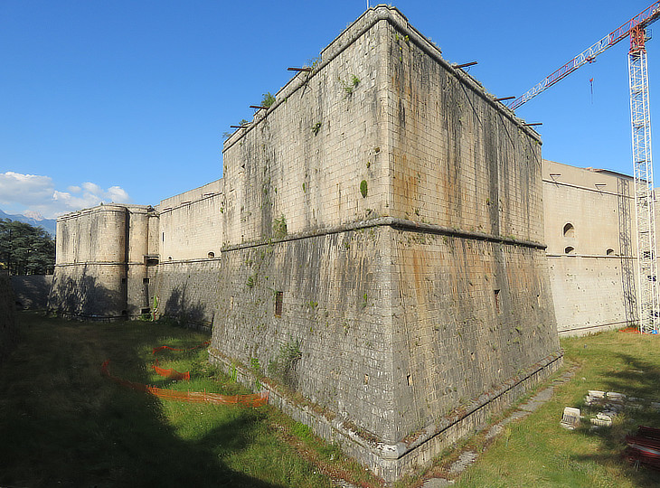 The Citadel built during the vice royalty of Don Pedro de Toledo in 1543, by the well-known Spanish engineer Pedro Luis Escrivá, is one of the most massive and imposing fortresses of the 16th century in Italy, though it is of course useless as a defence against the modern system of artillery. It is a regular square flanked by low towers; its curtains are 24 feet in thickness, and the fosse which surrounds it is 70 feet broad, and 40 feet deep. The walls are built with extraordinary precision and strength, as indeed is proved by the fact that they have been unaffected by any of the earthquakes from which the city has suffered. A portion of the fortress is now used as a prison, and a small garrison is maintained in it. Strangers are not allowed to enter without permission from the governor. Murray 1853
