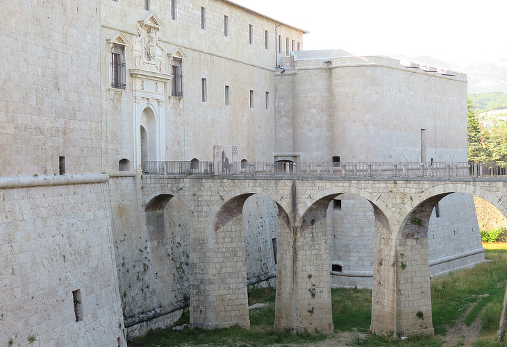If we follow the Via del Castello we reach the Citadel, a massive square edifice with low towers, constructed by the Spaniards in 1543, and surrounded by a moat. This point affords the best View of the Gran Sasso, the town, and the mountainous environs.