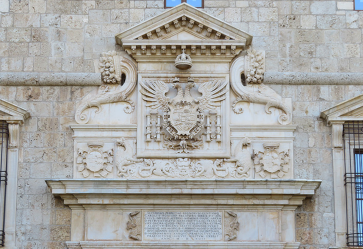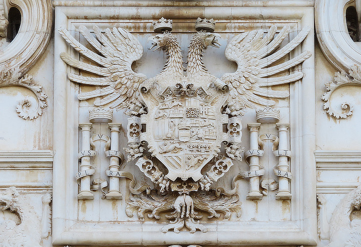 Spanish Castle: coat of arms of Emperor Charles V surrounded by the Collar of the Golden Fleece; in addition to the heraldic symbols of Castile, Leon, Aragon and Granada (upper left quarter), it shows those of Navarra, Jerusalem, Hungary, Austria, Flanders, Brabant and Burgundy