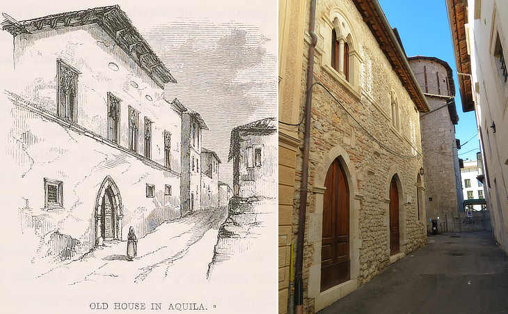 (left) An illustration by Edward Lear; (right) Casa di Buccio di Ranallo (XIVth century) and the apse of S. Maria di Paganica